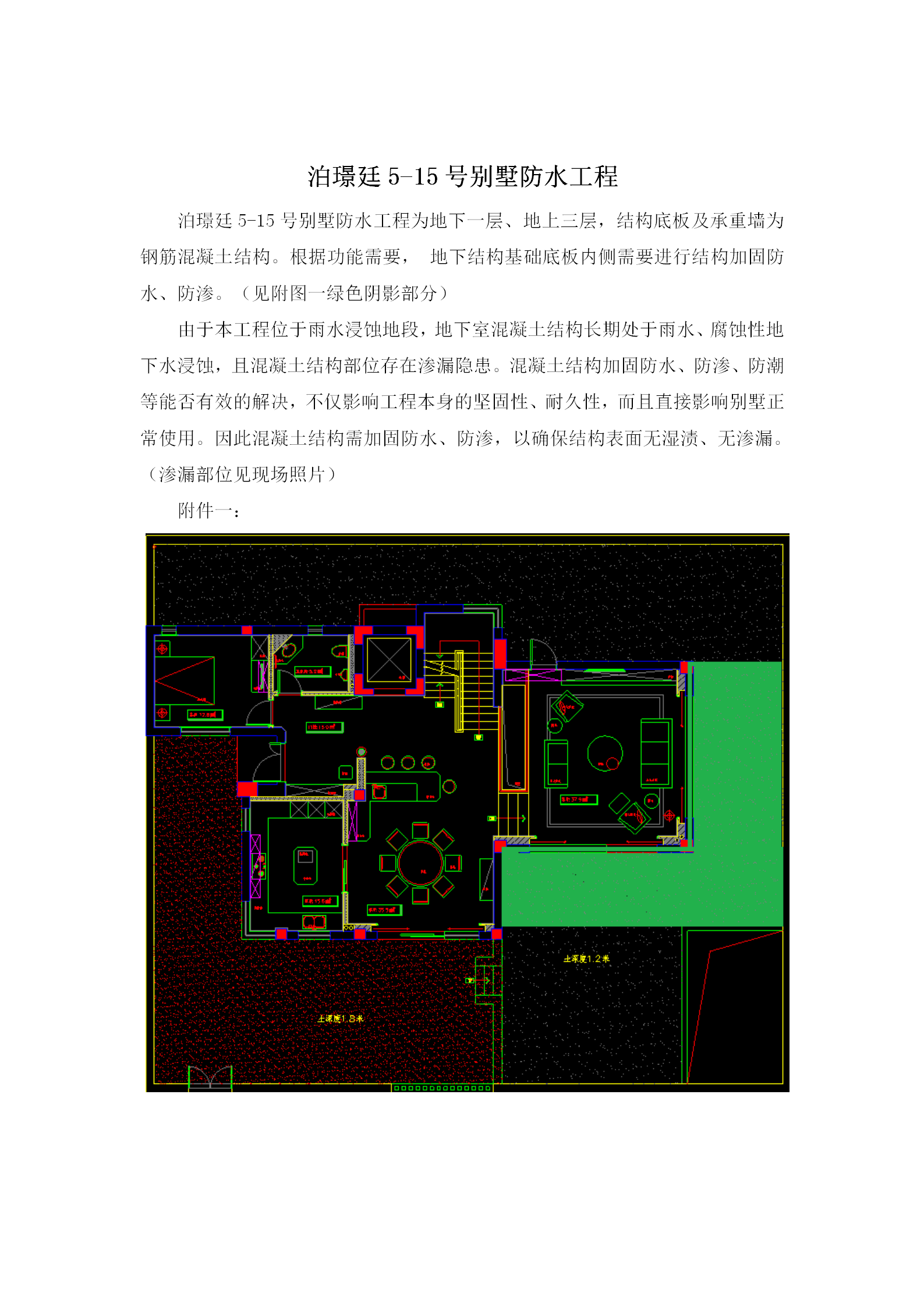 泊璟廷5-15号别墅防水工程为地下一层、地上三层,结构底部及承重墙为钢筋混凝土结构。根据功能需求,地下结构基础底部内侧需要进行结构加固、防水、防渗。